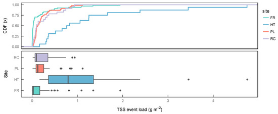 Empirical cumulative distribution functions and boxplots of site-specific monitored Total Suspended Solids (TSS) event loads (FR: Flat Roof, HT: High Traffic Street, PL: Parking Lot, RC: Residential Catchment).