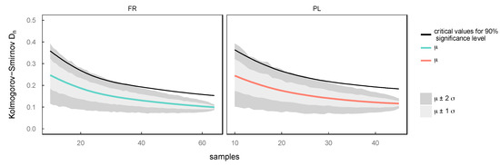 The results obtained from the Monte-Carlo-based sampling are shown in Figure 4. It shows the mean (colored solid line) and regions of one and two standard deviations (grey shaded areas) of Kolmogorov-Smirnov’s statistic as function of sample size for site FR and PL. Furthermore, critical values for the 90% significance level are illustrated (black solid line).