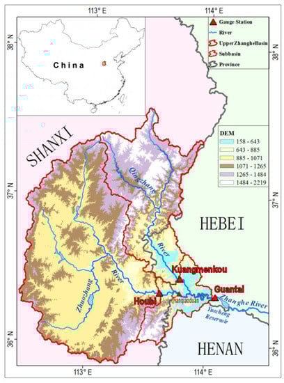 The Zhanghe River, a major tributary of the South Grand Canal in the Haihe River Basin, originates in Shanxi province and flows eastward through the administrative boundaries along Hebei and Henan provinces. The Upper Zhanghe River Basin refers to the region above the Yuecheng Reservoir’s Guantai Section, controls drainage area of 17,800 km2, stretching between longitudes 112.44–114.06° E and latitudes 35.86–37.60° N, where mostly mountainous terrain with intermontane Shangdang Basin exists (Figure 1). The river system is arranged in a fan, thick branching pattern, flowing across the Taihang Mountains, with steep mountains, overlapping peaks and sparse vegetation on both sides. Only few river terrace and flood land is left as subsistence farmland resources for local residents along the river (around 133 to 200 m2/capita). At the beginning of this centenary, this region has 4.188 million population (mostly farmer); many reservoirs and irrigated districts; and a rapid industrial growth, with insufficient irrigation water (about 400 m3/capita/year) and a high industrial and agricultural output value ratio (4.29 in 2000), therefore water resources are in great demand; however, deficient and unevenly distributed in time and space. The regional annual mean precipitation is about 570.4 mm, approximately 73% of which concentrates in one or two heavy rains at late July or early August. Hence, the natural stream flow distribution disaccords with agricultural water demand, while the irrigation season is April-to-June and November, when are low water months. There are two main tributaries in the Upper Zhanghe River Basin, Zhuozhang River and Qingzhang River, each mainly gauged by one hydrological station at downstream section, the Houbi station (Shanxi) controls 11,206 km2 area of Zhuozhang River Basin and the Kuangmenkou station (Hebei) 4159 km2 area of Qingzhang River Basin. The Zhanghe River Upstream Authority manages the whole region through the Houbi-Kuangmenkou-Guantai Reach (HKGR in the paper), to be more exact, from the Houbi and Kuangmenkou sections on tributaries to Guantai section of mainstream. The HKGR is the major water resources consumption of the Upper Zhanghe River Basin, as the water source for 49 villages in three provinces, containing four big irrigation canals, the Red Flag Canal, Yuejin Canal, Dayuefeng Canal, and Xiaoyuefeng Canal. Complicated natural environmental conditions, severe water scarcity, upstream-downstream shared rivers and ever-growing large population drive the region into one of the most prominent areas with frequent water-related disputes and conflicts nationwide.