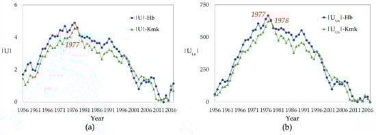 Abrupt change detection for annual runoff series during 1956–2017 of two tributaries at Houbi (Hb) and Kuangmenkou (Kmk) sections, with maximum values of |U| in MRS test and |Ut,n| in Pettitt test both appearing in 1977 at Hb section, as for Kmk section, 1977 and 1978 showed similar extreme values in both tests, though with different results. (a) MRS test statistic |U|, based on formula (1); (b) Pettitt test statistic |Ut,n|, based on formula (2).