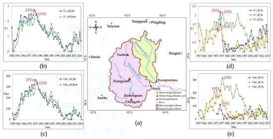 Variation analysis of annual area and station precipitation. (a) National meteorological stations selected and their distribution, in green and red. All have contributed to annual area rainfall calculation for two sub-basins (b,c), and three in red were also tested to analyze trends in the Zhuozhang River basin (d,e); (b) MRS test (|U|) for area precipitation (1956–2017) of Houbi(|U|_AP_Hb) and Kuangmenkou(|U|_AP_Kmk); (c) Pettitt test (|Ut,n|) for area precipitation of two sub-basins during the same period; (d) MRS test for station precipitation of Changzhi (|U|_SP_Cz 1973–2017) at south source, Yushe (|U|_SP_Ys 1957–2017) at north source, and Xiangyuan (|U|_SP_Xy 1957–2017) at the merge of south and west source of the Zhuozhang River; (e) Pettitt test for station precipitation of three stations in different source regions in the Zhuozhang River basin.