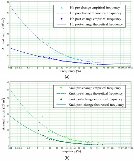 The univariate p-III distribution of annual runoff subseries of two tributaries during the pre-change and post-change periods. (a) Annual runoff distribution at Houbi (Hb) section; (b) Annual runoff distribution at Kuangmenkou (Kmk) section.