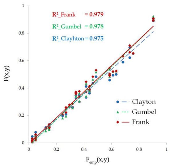 A copula is a function that links the same amount of marginal distributions to form a multivariate distribution function, which offers a possibility to model the dependence structure independently of the marginal distributions. Assuming that two random variables (X and Y) are related, Sklar’s [24] theorem states that if FX,Y (x,y) is a bivariate distribution function with marginal cumulative distribution functions FX (x) and FY (y), a copula C can be denoted as