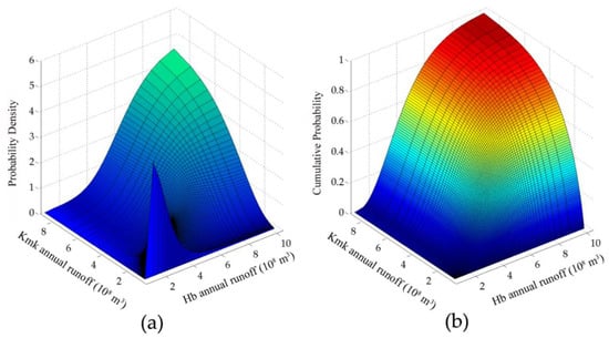 Joint distribution in the case of Frank copula. (a) Probability density distribution; (b) Cumulative probability distribution.