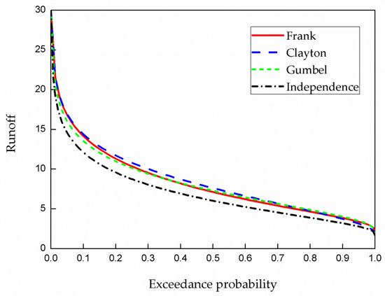 The cumulative distributions of copula-based models were calculated and plotted with the independence case in Figure 7. DFs in national HFA are commonly 50%, 75%, 90% and 95% on behalf of normal year (p = 50%), dry year (p = 75%), and extreme dry year (p = 90% or 95%). Interesting results are displayed in Table 6.