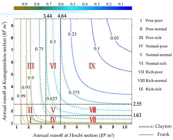 The encounter risk of runoff of main two tributaries was analyzed by the joint CDF , based on the frequency of 37.5% and 62.5%. 62.5% is the median of special probabilities for normal (50%) and low flow (75%); to guarantee that 50% still at the center of the normal flow range, the probability of 37.5% was selected reciprocally, between normal and high (25%) flow. The two probabilities were commonly adopted in encounter situation classification in China, for example, Zhang et al. [32]. Hence, the cumulative distribution p-III(x) ≤ 37.5% serves as wet year, 37.5% < p-III(x) ≤ 62.5% as normal year and p-III(x) > 62.5% as dry year, in a univariate setting. Then make the joint cumulative distribution be as synchronous wet year, as synchronous normal year and as synchronous dry year, called synchronous hydrological year, otherwise, it is asynchronous hydrological year for the region. In our case, the boundary values of marginal distributions were the design annual runoff 3.44 × 108 m3(px = 62.5%), 4.64 × 108 m3(px = 37.5%) at Houbi section (X) and 1.63 × 108 m3(py = 62.5%), 2.55 × 108 m3(py = 37.5%) at Kuangmenkou section (Y). The synchronous-asynchronous encounter situations of rich-poor annual runoff of tributaries could be classified as (with unit 108 m3): Rich-rich encounter probability: prr = P (X ≥ 4.64, Y ≥ 2.55); Rich-normal encounter probability: prn = P (X ≥ 4.64, 1.63 ≤ Y <2.55); Rich-poor encounter probability: prp = P (X ≥ 4.64, Y < 1.63); Normal-rich encounter probability: pnr = P (3.44 ≤ X < 4.64, Y ≥ 2.55); Normal-normal encounter probability: pnn = P (3.44 ≤ X < 4.64, 1.63 ≤ Y <2.55); Normal-poor encounter probability: pnp = P (3.44 ≤ X < 4.64, Y < 1.63); Poor-rich encounter probability: ppr = P (X < 3.44, Y ≥ 2.55); Poor-normal encounter probability: ppn = P (X < 3.44, 1.63 ≤ Y < 2.55); Poor-poor encounter probability: ppp = P (X < 3.44, Y <1.63). The Clayton copula offered an extreme option in bounding case, thus was also selected, to compare with Frank copula and research the sensitivity of the choices of copulas. The contour lines of the joint cumulative distribution for annual runoff of two tributaries and their encounter situations are displayed by Frank and Clayton copulas in Figure 8, and the results are in Table 8.