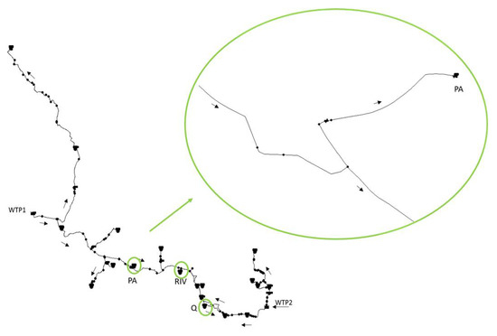 In a preliminary study, the potential for energy recovery in a Portuguese water supply system was assessed and analyzed [18]. The following approach was based on average monthly head and flow rate data, despite the water demand greatly varying from winter to summer seasons due to the system’s location in a touristic area in the south of Portugal (Algarve). Three locations were identified as feasible for the installation of energy recovery solutions (see locations PA, RIV and Q in Figure 1). These sites correspond to the inlet of storage tanks supplied by gravity. Given the high seasonal demand variation, a more accurate feasibility analysis is necessary for estimating the effective energy recovery potential.