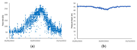 The proposed methodology will be further applied to assess the energy recovery potential in the most favorable site (PA). Time histories of flow rate and pressure data collected at the inlet of the PA storage tank over one year are used for a more detailed analysis (Figure 2). The chosen year reflects the typical behavior of flow rate and pressure variation in the system. Flow rate data were collected on an hourly basis, while pressure was registered only on a daily basis. This low measurement frequency of pressure is due to the pressure variation being hardly noticeable during the day, which is typical of water transmission systems; relevant pressure variations in this system are only associated to significant increases of flow rate (see pressure-head variation in one year in Figure 2b).