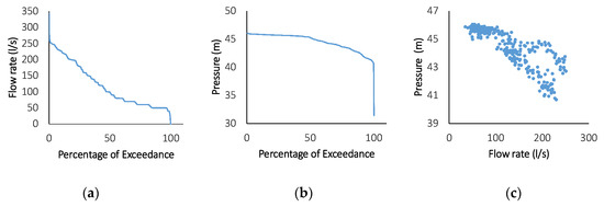 Contrarily, pressure only varies from 41 to 46 m throughout the year (Figure 2b) and remains constant at approximately 46 m through c.a. 50% of the time (Figure 3b). As expected, the pressure varies opposite to the flow rate, as it reaches maximum values (46 m) in winter when the flow rate is minimum and minimum values (41 m) in summer (Figure 2 and Figure 3c). This suggests that a constant available head of at least 41 m is available throughout the year.