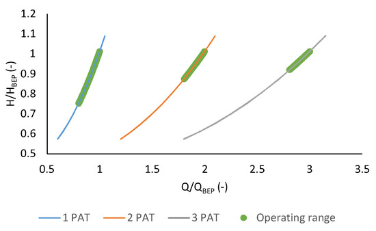 For the simulation of the simultaneous operation of two and three units in parallel with equally distributed flow rates, two additional curves are computed. These curves describe the global behavior of the PAT, being calculated by multiplying the flow rate Q in Equation (4) by a factor of two (Equation (5)) and three (Equation (6)).
