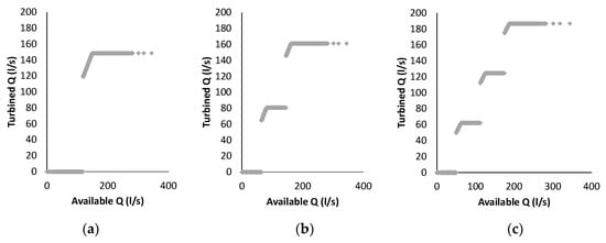 Turbined flow rate vs. the available flow rate at the site for (a) one PAT, (b) two PATs and (c) three PATs installed in parallel.
