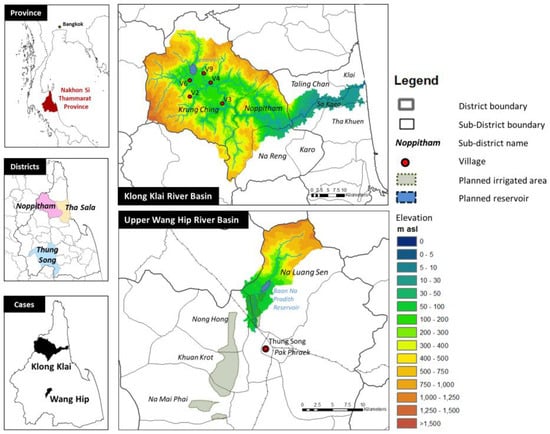 The project aimed to build a multi-purpose dam in the Thung Song district, bringing water to the town of Thung Song for domestic and industrial use. The upper Wang Hip basin, where the reservoir would be constructed, is covered with forests, which include para-rubber (see map in Figure 1). Two weirs are present in the river. In the lower parts, the urban district is located as well as para-rubber plantations and homesteads, some of which are irrigated. The dam would have a storage capacity of 20 million m3. Presently, the town has an insufficient and irregular water supply with low pressure in the dry season, and only 13 out of the 20 villages are served by a piped water system; the rest use groundwater. In the town of Thung Song, some 27,000 inhabitants would benefit from improved water service. In the three rural sub-districts (Nong Hong, Khuan Krot, Na Mai Phai), the population would benefit mainly through an increased supply of piped water and irrigation extended from the current 160 ha used by 400 households and 2000 residents in three villages, presently served by the Baan Na Pradith reservoir with a capacity of 117,000 m3 to a planned 2080 ha of total irrigated land in 24 villages in four sub-districts. In total, the beneficiary population would comprise 40,193 people in 12,821 households []. According to RID officials, the Wang Hip River contributes to the flooding of the Thung Song district in the lower (urbanized) part of the river basin during the rainy season (May–December). However, this is disputed by the upstream people whose land would be affected by the dam project.