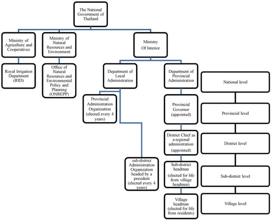 In the Thai government governance structure (Figure 2), two community leadership structures of authority reside under the Interior Ministry related to water resource development: local administration (with representation at provincial and sub-district levels) and regional administration (at provincial, district, sub-district, and village levels). Under the local administration structure, sub-district administrations are headed by a president who is elected every four years in normal situations. However, during the study, Thailand was under military rule, banning elections at every level. The role of sub-district administrations concerns local economic, social, and cultural development, with a budget partly from local tax collections. They also make decisions on approval of communal land to be used for reservoir construction in the sub-district. Conflicts between different stakeholders are a priority in the sub-district level decision making. The presidents focus mainly on ensuring the community acceptance of projects to avoid opposition against a project during construction. Under the regional structure, a provincial governor is appointed by the Ministry. One level lower is the district, which is governed by the assigned district chief. At the sub-district level, the chief is selected by village headmen at the lowest level. Chiefs mainly are coordinators between regional governments and villagers. Their role includes resolving conflicts between the regional government and local administration and acting as the resident representative defending negatively affected residents. The headmen are elected for life and take office until their retirement at sixty years old, or earlier. They have a strong influence on villagers’ perspectives towards reservoirs and other water infrastructure projects and in negotiating compensations. Hence, village headmen are the community leaders and are powerful actors in conflicts between the government and affected stakeholders.