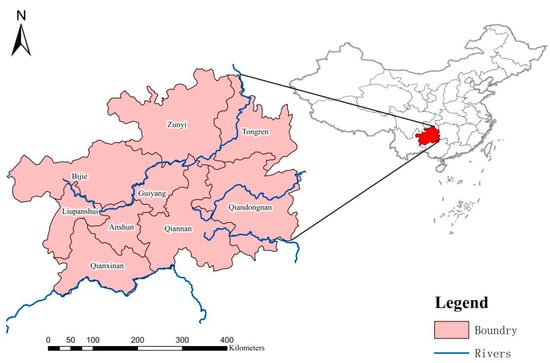 Guizhou Province, in southwest China, is a typical karst region located at longitude 103°36′ E–109°35′ E and latitude 24°37′ N–29°13′ N (Figure 1). It covers an area of 176,167 km2, with an average elevation of about 1100 m. The karst area spans about 61.9% of the province and is characterized by soluble carbonate rocks. Guizhou has a subtropical highland humid monsoon climate, featuring abundant rainfall and indistinct seasonal differences. With an annual rainfall of 1100–1400 mm, the amount of surface water resources is more than 120 billion m3. Meanwhile, due to the strong karst evolution, water resources are seriously affected. The per capita share is slightly higher than the national average, but the usable amount is lower than the national average. The annual consumption of water is about 10 billion m3. The consumption of agricultural water makes up the largest proportion, about half of the total water consumption, while ecological water consumption is the least, with a proportion of less than 1%.