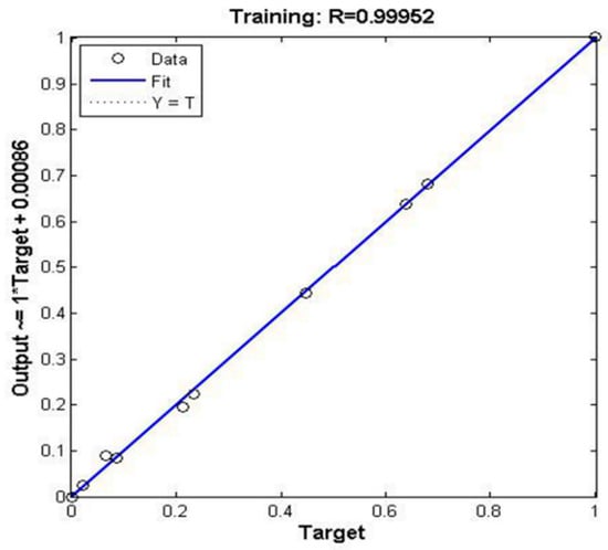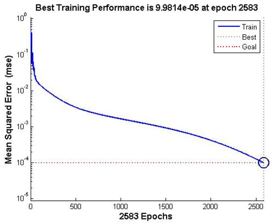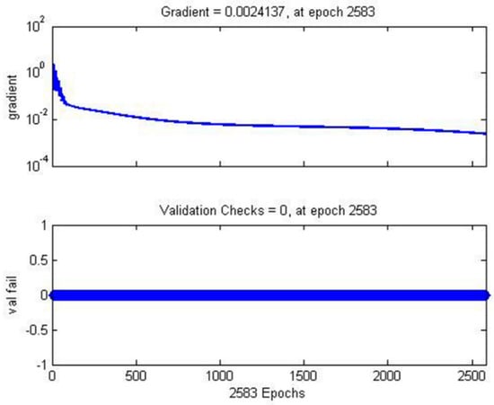 A procedure to create the network is written as net=newff(minmax(p), [7,1], {‘tansig’,’purelin'},’traingdm’). After normalization of input and output data, the BP neural network training process is as shown in Figure 2. It can be seen that neural network error reaches the target error of 0.0001 only after 2583 trainings; the error results meet the training requirements. The model can be judged according to R value. The closer R is to 1, the better the model and the higher the prediction accuracy It can be seen from Figure 3 and Figure 4 that all validation checks and gradients of the model decrease as training times. The mean square error is close to 1 and error gradient descent is 0.0024, so the neural network fits well with the training data. The trained network can better predict the training data.