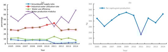 Obstacles to water resource security in the karst area. (a) Groundwater supply ratio, industrial water utilization rate, water use efficiency and water production modulus; (b) Per capita grain production.
