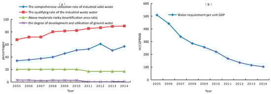 As can be seen from Figure 6, in Guizhou Province from 2005 to 2014, the comprehensive utilization rate of industrial solid waste increased from 34.1% to 56.9%, the qualifying rate of industrial wastewater increased from 67.7% to 89.5%, above moderate rocky desertification area ratio decreased from 20.39% to 17.16%, water requirement per unit GDP demand changed from 509 m3/104 RMB to 103 m3/104 RMB, and the degree of development and utilization of groundwater decreased from 3.18% to 0.95%. These five indices are the driving factors of water resource security. For a decrease or increase of 0.1 standard deviation units, the contribution to reducing the degree of deviation was 0.0328, 0.0277, 0.0214, 0.0194, and 0.0162, respectively.