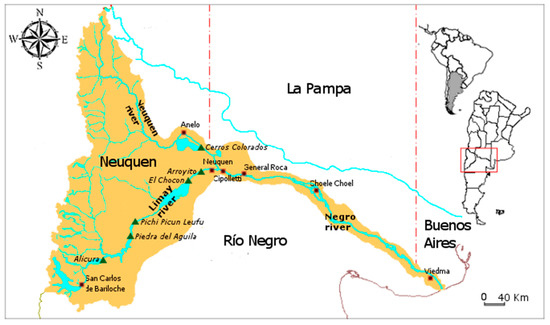 The Limay, Neuquén, and Negro River basins are in the northern section of the Argentinian Patagonia, covering an area of 140,000 km2 that is primarily the territory of the Province of Neuquén. The river basins extend into both the Provinces of Río Negro, and Buenos Aires (Figure 1). The Neuquén River, with an average flow of 280 m3/s, drains an area of 30,000 km2. The Limay River has an average flow of 650 m3/s and drains an area of 56,000 km². Both form the Negro River that drains a basin of 116,000 km2, with an average flow of 930 m3/s.
