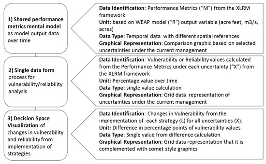 Effectively communicated model output is critical to effective decision-making. WEAP model outputs correspond to the performance metrics (M) from the XLRM framework. Stakeholders can explore and interact with the visualization in three progressive steps that transform the model output to meaningful information. Forni et al. (2016) describes three steps for Decision Space Visualizations (DSVs) that account for knowledge exchange and help construct a shared mental model of a region’s water resources system regarding its current state, future challenges, and opportunities. The three steps as shown in Figure 2 are: (1) analysis of modeling output time series; (2) data fusion to a single value form; and (3) decision space visualization. In the case study, this visualization methodology was implemented to present ensemble model output results in a participatory and interactive process.