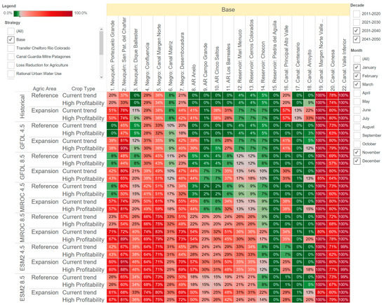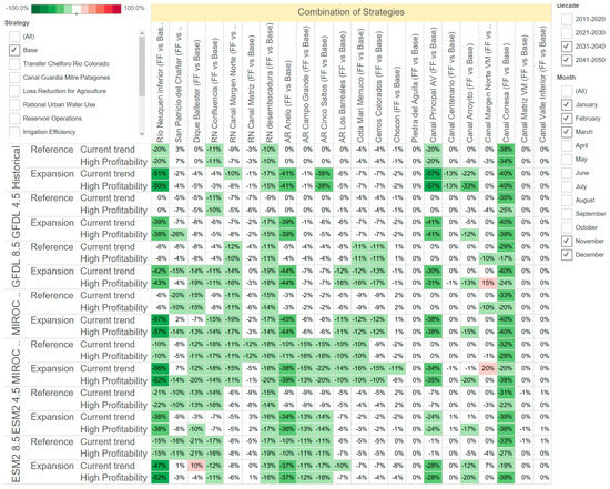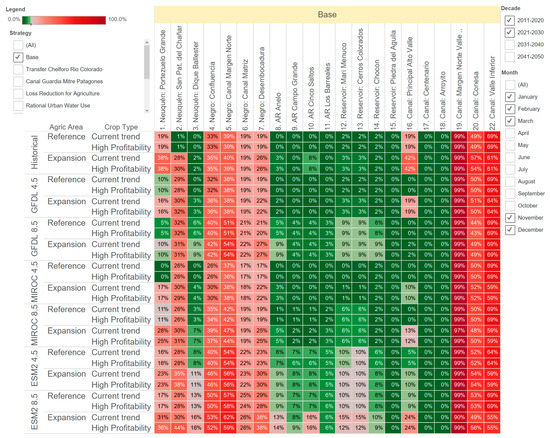 Figure 7 contains an image of the visualization dashboard showing the changes in the frequency of failure when various strategies are implemented. As expected, the strategy that contemplates the combination of all strategies is the one that provides the greater magnitude of impacts. The combination of all strategies includes changes that are more integrated and reduces the failures in all metrics, although in small proportions for some metrics and minimally for Canal Matriz and Canal Valle Inferior. A series of strategies improved the outcome of the region when they were integrated (not evaluated in isolation). Reducing agricultural water losses and implementing irrigation efficiency strategies seem to reduce the negative impacts on environmental flow metrics in the Neuquén River and some of the canal flows, primarily in the scenarios where agricultural production is expanded.