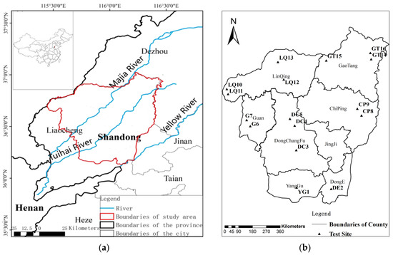In this experiment, the tracer test area was selected by the preliminary investigation. The precipitation concentrated on the flood season (June–September), and the irrigation water concentrated in two periods, or the period from March to May and the period from September to November in the research area. Considering the effects of precipitation and irrigation on the movement of bromine tracers, before the irrigation begins the bromide was injected during 9–11 February 2015. The flood season was divided into two stages and the first sampling time was selected on 25–29 July 2015. The second sampling time was selected on 3–7 May 2016 when the irrigation ended. According to the attributes of the testing site, such as spatial location, irrigation, crop planting and so on, a total of 16 sampling points in seven representative sites (i.e., the Dongchangfu (DC), Linqing (LQ), Yanggu (YG), Chiping (CP), Donge (DE), Guan (G), and Gaotang (GT) sites) were selected for particular research (Table 1 and Figure 1b). However, among them 2 sampling points were abandoned due to the construction of houses and roads. General features of the sampling points are listed in Table 1.