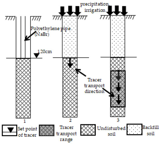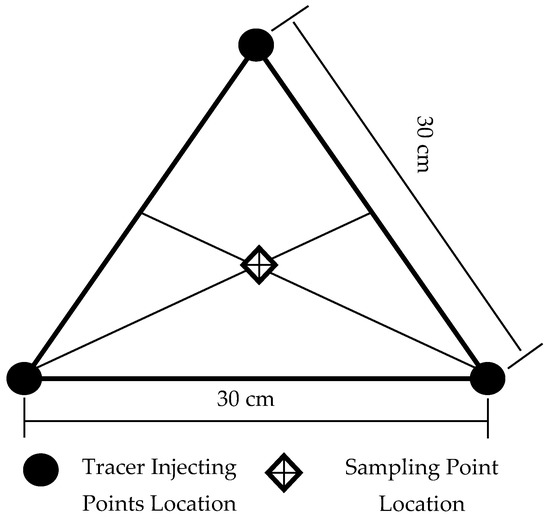 To ensure a relatively uniform tracer mass concentration distribution at the different depths of the tracer, a tracer was injected using a porous deep injection method, as shown in Figure 3. Three holes (2 cm in diameter and 120 cm deep) at the vertices of a 30 cm equilateral triangle were drilled with a sampler for bromine injecting. The hole forming was carried out by using a Luoyang shovel. We put the Luoyang shovel into the inside of the polyethylene pipe and the pipe was also brought into the underground by the Luoyang shovel. The polyethylene pipe was used as a conduit for the injection of bromine tracers. 50 g NaBr (the bromide tracer) was injected at the holes through a conduit. Finally, the pipe was removed from the underground at intervals of 5 cm, then buried with raw soil and subjected to soil compaction. Multiple sampling can be collected near the midpoint of the three injecting points, but did not repeat the sampling points last time.