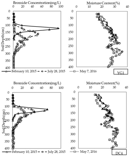 3.1. Bromide Concentration and Moisture Content in the Typical Sites