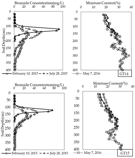 From Figure 4 it can be seen that the downward movement of the tracer peaks was determined by the shape of the curve from the profiles, the largest value of tracer concentration. The unimodal shape of the bromine concentration curve is consistent with most studies. Bromide concentration distribution varies considerably at different depths, and has a peak that moves downward gradually with increasing time. Moreover, the velocity of bromine in an irrigation area is greater than that in a non-irrigated area. In the same position, from the two sampling bromine concentration curve and table, we can see that the peak value and the depths of the peak value in GT14 with irrigation were larger than that in GT15 without irrigation.