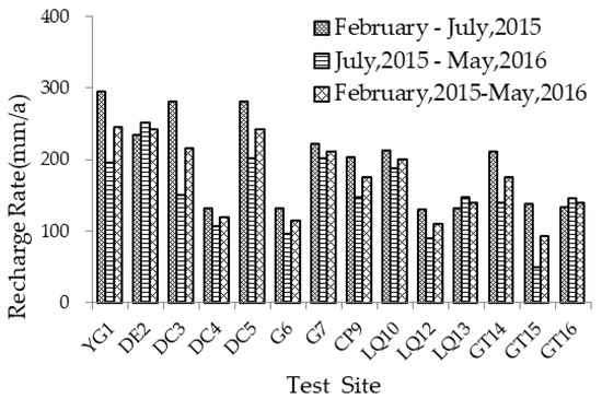 It can be seen that the annual recharge rate from 2015 to 2016 was 85.5–243 mm/a (0.23–0.66 mm/day), with an average in different sites of 168 mm/a. The recharge rates were influenced by the irrigation district location, irrigation type, and crop type.