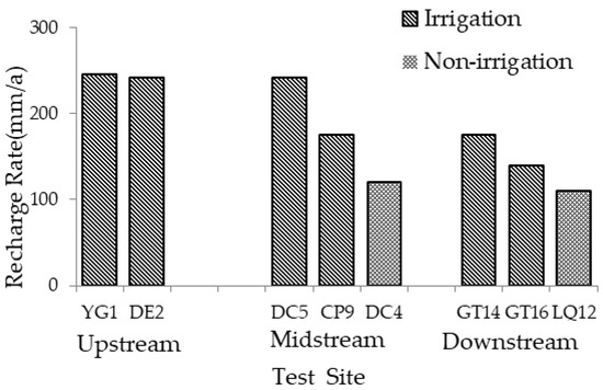 Conditions of YG1, DE2, DC5, CP9, GT14, and GT16 (irrigation, winter wheat-summer maize) were almost the same except the irrigation district location. The recharge rates of YG1 and DE2, (upstream district) were 246 mm/a and 243 mm/a, respectively. The recharge rates of DC5, CP9 (midstream) were 242 mm/a and 177 mm/a, respectively. The recharge rates of DT14 and DT16 (downstream) were 176 mm/a and 140 mm/a, respectively. The results showed that the recharge rates for upstream irrigated cropland were greater than those for downstream irrigated cropland. The same was true for sites with non-irrigation and the same crops (DC4 and LQ12 as shown in Figure 6). Underpinning this phenomenon is that the soil texture in the upstream district was much coarser than in the downstream, resulting in more rainfall and irrigation water infiltrated into the underground. The conclusion agreed with Vucic’s view that coarse soil results in more groundwater recharge [35].