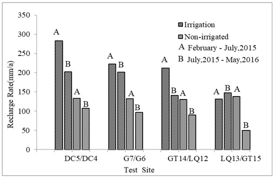 In the two-year experiment, a comparison of the paired locations (DC5 and DC4, G7 and G6, DT14 and LQ12, LQ13 and GT15) that had nearly the same irrigation district location and crop types showed that there was generally a greater recharge in irrigated lands (DC5, G7, DT14, and LQ13, with an average of 192.5 mm/a) than in non-irrigated lands (DC4, G6, LQ12 and GT15, with an average of 109.7 mm/a) (Figure 7). It is indicated that the utilization rate of irrigation water in irrigated cropland was low and a considerable quantity of irrigation water seeped in to recharge the groundwater. The results show that recharge rates for irrigated cropland were greater than for non-irrigated, non-cultivated land, probably because less irrigation water was absorbed by crop and more irrigation water recharged to the groundwater in the form of irrigation return flow. The results in this study are consistent with those of Wang et al. [10]. The existence of this phenomenon is mainly related to current irrigation methods, such as flood irrigation and other large scale irrigation methods. Therefore, to increase the utilization efficiency of irrigation water and reduce the ineffective consumption of water resources, the sprinkler irrigation technique, which has the advantages of saving water, should be widely used in farmland irrigation.