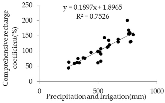From the view of the supply source, the table shows that precipitation and irrigation are an important part of groundwater recharge, which shared about 76.5 percent of the total amount of recharge. From the view of the supply time, the key periods were the flood season and irrigation period. We could draw a conclusion that the groundwater recharge was affected by precipitation and irrigation, and the two factors cannot be distinguished. This conclusion agrees with the views of Allocca et al. [38] and Owor et al. [39]. Thus, the comprehensive recharge coefficient was adopted to determine the spatial distribution characteristics of the groundwater recharge rate in the irrigation area, which can separate the atmospheric precipitation from the infiltration coefficient. According to the average result of bromide tracing, the effects of precipitation or irrigation on the recharge were quantitatively analyzed. There was a linear relationship between the groundwater recharge and the precipitation and irrigation (R2 = 0.7526, P < 0.05), which is shown in Figure 8. The linear relationship by the least-squares fitting was R = 0.1897 (P + I) + 1.8965, where R is the comprehensive recharge coefficient (mm/a), P is the precipitation (mm), and I is the irrigation (mm).