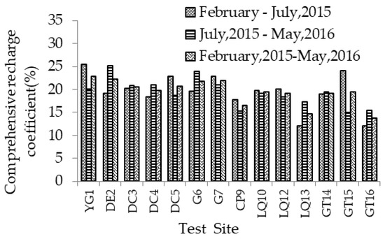 The precipitation data was provided by the Liaocheng Hydrological Bureau, and the amount of surface water irrigation was obtained through investigation. The investigation indicated that the cropland irrigation had all adopted a border irrigation with an irrigation quota of 80 m3 for farmland; however, the irrigation quota was relatively small for orchards. Four irrigations were carried out each year between March to May and September to October, so from February 2015 to July 2015, the irrigation water amount was 240 mm for farmland and 180 mm for orchard. According to the tracer test results, the comprehensive recharge coefficient of each testing site was calculated during different testing periods (Table 5 and Figure 9).