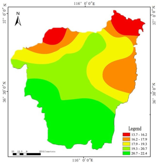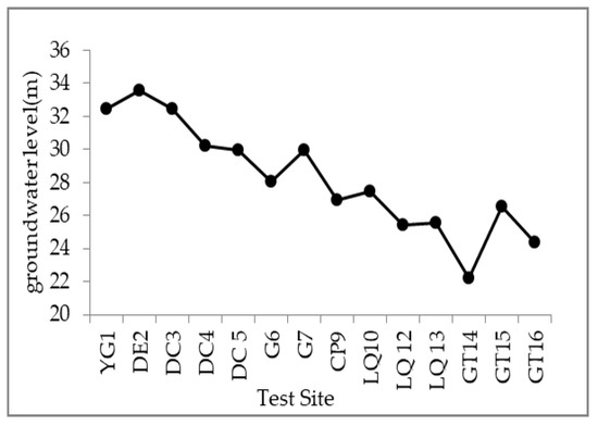 From this, we obtained the data about the groundwater level at each sampling point (Figure 12). A certain positive correlation was found between the groundwater level and the comprehensive recharge coefficient (Figure 13), which was consistent with Meng’s conclusion [40]. It can be seen that the recharge coefficient increased with the level at the higher groundwater level, but the correlation between the two was no longer obvious at the lower groundwater level. This conclusion agreed with the views of Tan et al. [32]. The reason of this phenomenon was worth further research. Thus, the evaporation capacity data were spatially interpolated by Kriging Spacial Interpolation methods to plot the spatial distribution map of the evapotranspiration, with the results shown in Figure 11b. It was found that the amount of evaporation was relatively large in the area where the groundwater level was deep and the amount of groundwater recharge was relatively small, which conformed with the phenomenon that the comprehensive recharge coefficient of the area was small. We believe that in the low groundwater level, rainfall and irrigation water are mainly used for evaporation rather than for groundwater recharge.