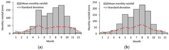 The climate of the study area is characterized by distinct rainy and dry seasons (Figure 2). During the rainy season, the amount of precipitation and its areal extent in the CPRB are caused by the southwest monsoons, together with typhoons, monsoon troughs, and depressions from the South China Sea. The mean monthly rainfall over the study area is large during May and October (PRB) or September (NRB), which corresponds to the southwest monsoon periods [] (Figure 2).