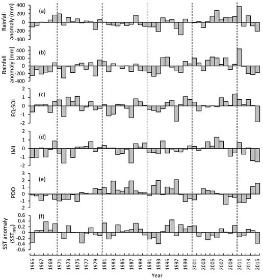When EQ-SOI is positive, i.e., when the surface trade winds are larger than normal, seasonal rainfall was not significantly related to any one of the tested indices; however, it was positively correlated to EQ-SOI (Figure 9a). Since the arrival and passage of typhoons and tropical cyclones are major causes of increased rainfall, it is likely that the trade winds and SSTs in the Pacific Ocean contribute to these phenomena, with additional influence on seasonal rainfall from the Indian Ocean and monsoon []. In this study, we applied an equation that considers interactive and non-linear relationships between the seasonal rainfall and ENSO and SST-related indices for the Pacific Ocean using quadratic functions (Equation (3)). In addition, we tested the inclusion of IMI and DMI as additional components in Equation (6) to consider the influence of the Indian Ocean and monsoon, respectively; however, there was no significant improvement for rainfall estimation: