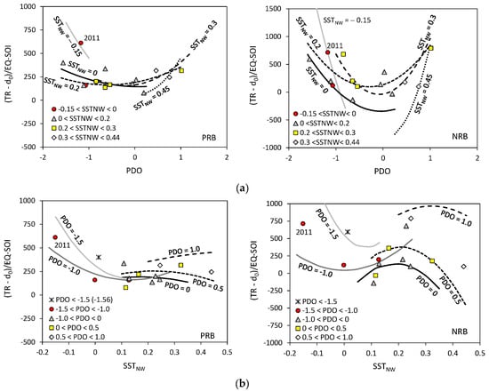 The lines in Figure 10a indicate that PDO increases the normalized rainfall anomaly when it is largely negative or positive for the same or similar SSTNW. Therefore, we confirmed that the sensitivity of Equation (3) is consistent with the recognized influence of PDO, i.e., abundant precipitation tends to occur during La Niña years and the PDO cool phase []. Furthermore, the results in Figure 10a suggest that the seasonal rainfall in PRB and NRB can increase with both negative and positive PDO as there was no clear relationship between EQ-SOI and PDO when EQ-SOI is positive, which is consistent with the data plots in Figure 9b (especially for NRB) as well as previous analysis [].