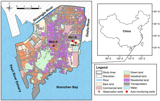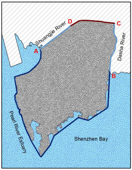 The study area is located in the southwestern coast of Shenzhen, China (Figure 1), with an area of 73.1 km2. It is adjacent to the Pearl River Estuary to the east and the Shenzhen Bay (also called Deep Bay) to the west. The time-average sea level in the Pearl River Estuary and Shenzhen Bay is about 0 m based on the Huanghai Vertical Datum. The Shuangjie River flows along the northwestern boundary of the area, with a length of 3.2 km and average water levels ranging from 7 m in the north to 0 m in the south. The Dasha River flows along the eastern boundary of the study area, with a length of 4.5 km and average water levels ranging 0–6 m. The area has a subtropical monsoon climate with very wet summer and dry winter. The mean annual rainfall is 1944 mm, and up to 85% of annual precipitation occurs during wet seasons from April to September.