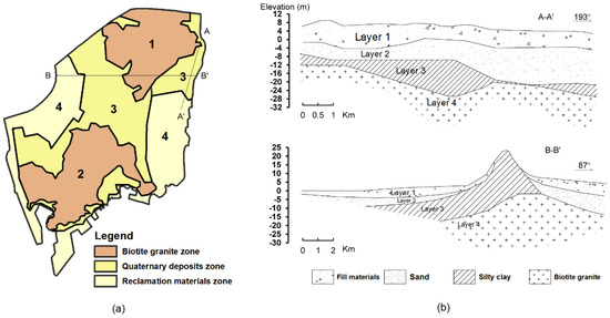 The geological division (Zones 1–4) in the study area (a) and the two typical cross sections of geological formation (b).