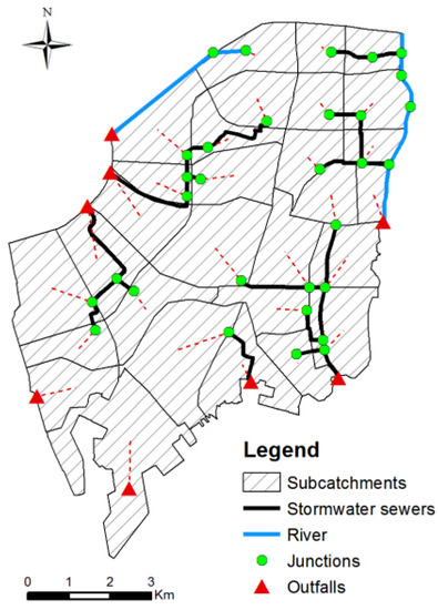 The study area is simplified to 29 subcatchments and 31 junctions for simulation according to the topography and drainage networks (Figure 3). As shown by the data of local land use and cover, the percentage of impervious covers of these subcatchments range from 9.5% to 86%. The Dasha River and the Shuangjie River are set as open channels, and the stormwater sewers are set as conduits in the model. The model simulates the rainfall-runoff process, which includes infiltration, depression storage, evaporation and surface runoff. The surface infiltration is estimated using the Green–Ampt equation and the infiltration rates range from 8 × 10−6 m/s to 1 × 10−5 m/s in the study area. The evaporation losses are estimated by the monthly-average potential evaporation rates which range from 2.7 mm/day to 3.9 mm/day during the dry months, and from 4.8 mm/day to 6.3 mm/day during the wet months, respectively. The other model parameters are set by referring to the existing studies and reports in this area [27,28]. The model can be used to evaluate the effects of the LID designs on the surface runoff and the infiltration.