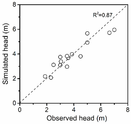 Figure 5 shows that the simulated groundwater head of the 15 monitoring wells is basically consistent with the measured data of September 2008. The root mean square error (RMSE) of groundwater head is 0.55 m, and the square correlation coefficient (R2) is 0.87. The accuracy of the model is relatively poor at the lithological boundary of biotite granite and Quaternary deposit (e.g., RMSE of 0.5–1 m) due to the complex geology and the uncertainty of hydraulic conductivity. The results indicate that the model can reasonably reflect the spatial distribution of groundwater head in the study area.
