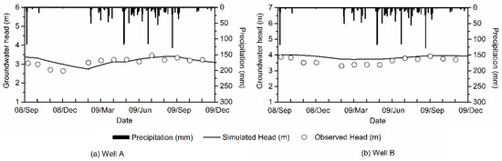The monthly variation of observed and simulated groundwater head of (a) Well A and (b) Well B during the period from September 2008 to December 2009.