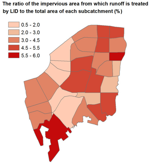 - Scenario 1: The runoff from 7.5% of impervious area in each subcatchment will be treated respectively by bioretention basins (2.5%), permeable pavements (2.5%), and green roofs (2.5%). The bioretention is designed to have the capacity to treat the runoff from the impervious area that is 10 times its own size according to the Technical Guidance for Sponge City Construction—Low Impact Development Rainwater System Construction [34]. For example, Figure 7 shows the LID implementation intensity of each subcatchment under Scenario 1.