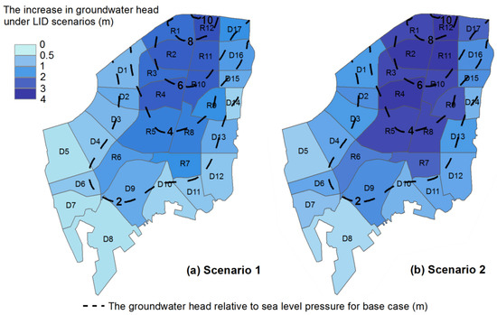 The 29 subcatchments can be divided into recharge zones (R1–R12) and discharge zones (D1–D17) according to the connectivity between the subcatchments and the receiving water. Under base case, the annual average groundwater head gradually decreases from 10 m at the upstream boundary to 0 m at the coastline (Figure 8). Compared with base case, the rise in groundwater head ranges from 0.2 m to 2.2 m, and 0.3 m to 3.9 m, respectively, under Scenarios 1 and 2. The groundwater head changes show similar spatial variability between Scenarios 1 and 2, which decreases gradually from recharge zones to discharge zones along the flow direction. However, there are several exceptions. For example, in recharge zones, R3 has less of an increase in groundwater head than nearby R4; in discharge zones, D9 has a greater increase in groundwater head than D10, and D14 has less of an increase as compared to D13.