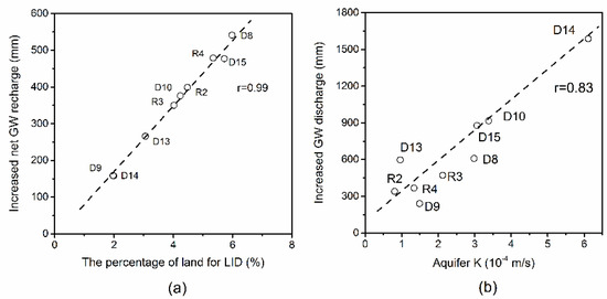 The groundwater head difference relative to base case is mainly determined by the difference between groundwater recharge and discharge. In order to investigate the factors that influence the spatial variation of groundwater head changes, the cumulative increase in net groundwater recharge and discharge in each subcatchment during the 10-year period was calculated for Scenario 1 (Figure 9). The results indicate that D8 and D15 have more of an increase in net groundwater recharge, while D9, D14 and D13 have less of an increase in net recharge (Figure 9a). Figure 10a shows that the increase in net groundwater recharge has positive correlation with the proportion of land for LID implementation with a correlative coefficient of 0.99 (sig = 0.01). The results implicate that the proportion of land for LID implementation is a key factor that influences the net groundwater recharge. The cumulative increase in groundwater discharge is usually affected by many factors such as increased aquifer recharge, the overlying soil property, and the distance from the receiving water. Figure 9b shows that D14, D15, and D10 have a greater increase in groundwater discharge while D9 and R2 have less of an increase in discharge. The increase in groundwater discharge has a positive correlation with the hydraulic conductivity of the main underlying aquifer, with a correlative coefficient of 0.83 (sig = 0.01) (Figure 10b). The results imply that the hydraulic conductivity of underlying aquifer is the main factor that influences the groundwater discharge.