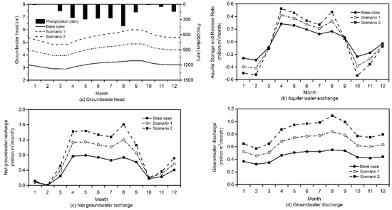 The seasonal variations of groundwater system in the whole area are illustrated in Figure 11 when it reaches equilibrium under the above three scenarios. In base case, taking Well A as an example, the groundwater head increases during the wet seasons (April to September) and decreases during the dry seasons (October to March) (Figure 11a). This is because the aquifer has a positive change in storage during the wet seasons and a negative change during the dry seasons (Figure 11b). Furthermore, the seasonal variation of groundwater head is determined by the state of aquifer water exchange. For example, the water absorption rate of aquifer in April is higher than that in other months, leading to the fastest groundwater head rise in the year, while the groundwater head has no significant decrease in December because the release rate of aquifer is close to zero. Figure 11b also indicates that aquifer can regulate hydrological processes like a sponge. It absorbs and stores the abundant infiltration of stormwater during wet seasons and releases the stored water in the dry months to maintain groundwater discharge. The state of aquifer water exchange is mainly affected by the net groundwater recharge. Generally, the aquifer absorbs more water when there is adequate recharge and releases more water in dry months with little rainfall (Figure 11c). In addition, the rate of aquifer water exchange is also affected by the antecedent dry period. For example, although the net groundwater recharge rates in April and August are nearly the same (0.8 million m3/month), the water absorption rate of aquifer in April is 0.11 million m3/month more than that in August. This can be explained by the greater storage capacity of aquifer in April due to the continuous water release in former dry seasons. Due to the “buffer” function of the aquifer, the seasonal change in groundwater discharge appears a relatively small fluctuation relative to the rainfall variations (Figure 11d), ranging from 0.32 million m3/month during the dry months to 0.55 million m3/month during the wet seasons.
