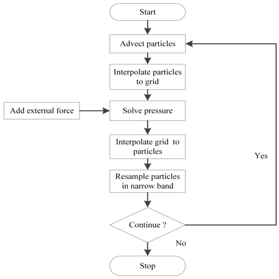 The flow chart of specific algorithm is shown in Figure 1. The transition from gird to particles are handled by sharp transition as shown in Equation (5). The reader are suggested to refer to reference [3] for more detailed discussion. is the final velocity for advection; is the velocity from FLIP method outside the narrow band; is the velocity from after advection in the narrow band.