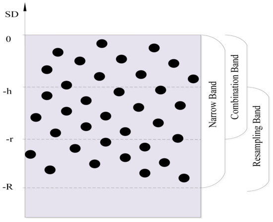 Another main difference between NBFLIP method and FLIP method is that the NBFLIP needs to resample the particles in the Narrow Band near the boundary. In this way particles are limited to the Narrow Band only, thus reducing the number of particles and improving computational efficiency. In this paper, SDF [15] is used for distance measurement. Signed Distance (SD) is the distance from a point to a triangular which can be calculated by CPM (Closest Point Method) [16], which will be discussed in the next section in details. Furthermore, self-sampling method is used to calculate the free liquid surface distance. As shown in Figure 2, region [−R, 0] is defined as Narrow Band, [−r, 0] as Combination band and [−R, −h] as Resampling Band. h represents the grid width, in normal conditions R = 3h , r = 2h. To avoid modifying to the free surface, particle resampling is only performed in the Resampling Band area. Only the particles in the Combination Band are interpolated.