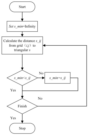 | Step1. Initial Smin=Inf. Inf is a big value used to initialize the Smin which will be replaced by the real distance in the next. Step2. Calculate the distance from grid (i,j) center to triangular S, the distance is set as s1. Step2.1 Compare Smin and s1, if Smins1, set Smin=s1. Step2.2 Else if Smin<s1, Smin remains the same. Step3. Repeat Step2, go through all the grids until finished |