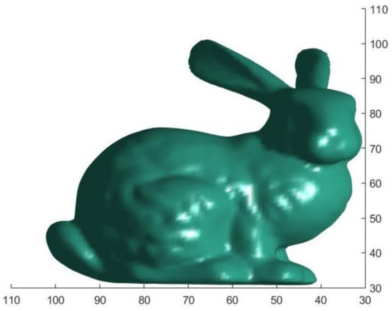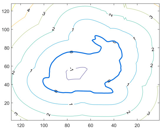 Figure 4 is the original bunny mesh; Figure 5 is the SDF calculated from Algorithm 1; Figure 6 is the contour line of SDF on obstacle profile. As can be seen from Figure 4 and Figure 5, the SDF calculated agrees well with the original mesh. The profile in Figure 6 gives the outline of the bunny, in which, the thickened line in the contour is the zero contour line to show the position of the obstacle. Once we get the SDF of the obstacle, we could employ it in fluid interaction in the next step.